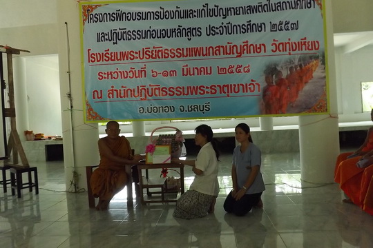 โครงการฝึกอบรมการป้องกันและแก้ไขปัญหายาเสพติดในสถานศึกษาและปฏิบัติธรรมก่อนจบหลักสูตร2557 โรงเรียนพระปริยัติธรรมแผนกสามัญศึกษา วัดทุ่งเหียง ต.หมอนนาง อ.พนัสนิคม จ.ชลบุรี 20140 ระหว่างวันที่ 6-13 มีนาคม 2558 ณ สำนักวิปัสนาพระธาตุเขาเจ้า ต.ห้องสูง อ.หนองใหญ่ จ.ชลบุรี